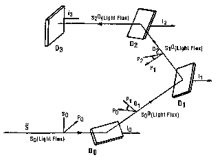 The diagram above shows the StokesMeter™ photopolarimeter for the simultaneous measurement of all four Stokes parameters of light. The light beam, the state of polarization of which is to be determined, strikes, at oblique angles of incidence, three photodetector surfaces in succession, each of which is partially spectrally reflecting and each of which generates an electrical signal proportional to the fraction of the radiation it absorbs. A fourth photodetector is substantially totally light absorptive and detects the remainder of the light. The four outputs thus developed form a 4x1 signal vector I which is linearly related, I=AS, to the input Stokes vector S. Consequently, S is obtained by S=A(-1)I. The 4x4 instrument matrix A must be nonsingular, which requires that the planes of incidence for the first three detector surfaces are all different. For a given arrangement of four detectors, A can either be computed or determined by calibration.
